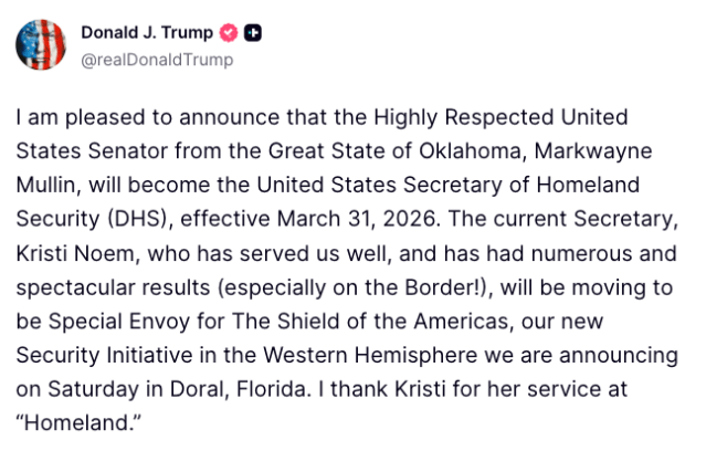 The president says Oklahoma Senator Markwayne Mullin will take over the department effective March 31.