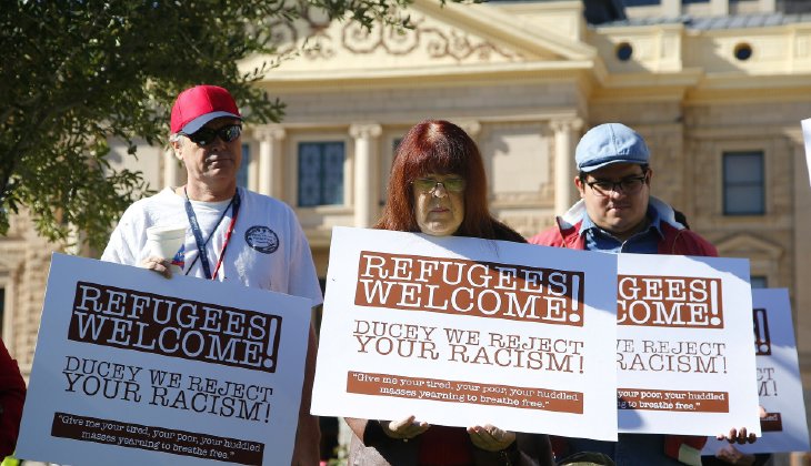 Supporters for the welcoming of Syrian refugees pause during a rally at the Arizona Capitol Tuesday, Nov. 17, 2015, in Phoenix. Arizona Gov. Doug Ducey has joined a growing number of governors calling for an immediate halt to the placement of any new refugees in the wake of terrorist attacks in Paris. The U.S. State Department says Arizona has received 153 Syrian refugees so far this year. (AP Photo/Ross D. Franklin)