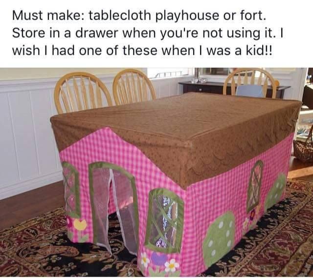 When my kids were young I used old sheets like that on the table and they made forts out of the chairs and sheets. The table they called their bunker.