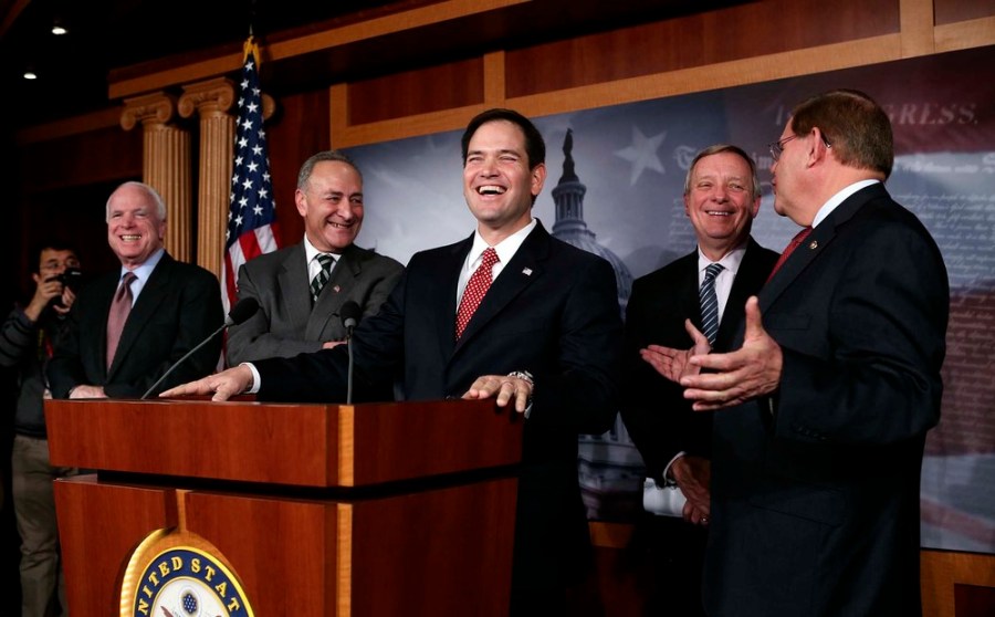JANUARY 28: Sens. John McCain (R-Ariz.) Charles Schumer (D-N.Y.), Marco Rubio (R-Fla.), Dick Durbin (D-Ill.) and Bob Menendez (D-N.J.) attend a news conference to announce that the bipartisan group has agreed on a set of principles for a sweeping overhaul of the immigration system, including a pathway to American citizenship for 11 million illegal immigrants. (Doug Mills/The New York Times)