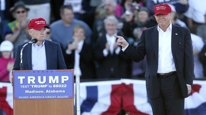 Republican presidential candidate Donald Trump, right, gestures as Sen. Jeff Sessions, R-Ala., speaks during a rally Sunday, Feb. 28, 2016, in Madison, Ala. (AP Photo/John Bazemore)