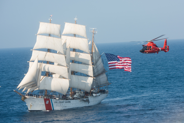An MH-65 “Dolphin” helicopter flies with the U.S. Coast Guard barque Eagle in the Atlantic Ocean on Thursday, July 30, 2015. The barque Eagle is the only active commissioned sailing vessel in American military service. (U.S. Coast Guard photo by Auxiliarist David Lau)