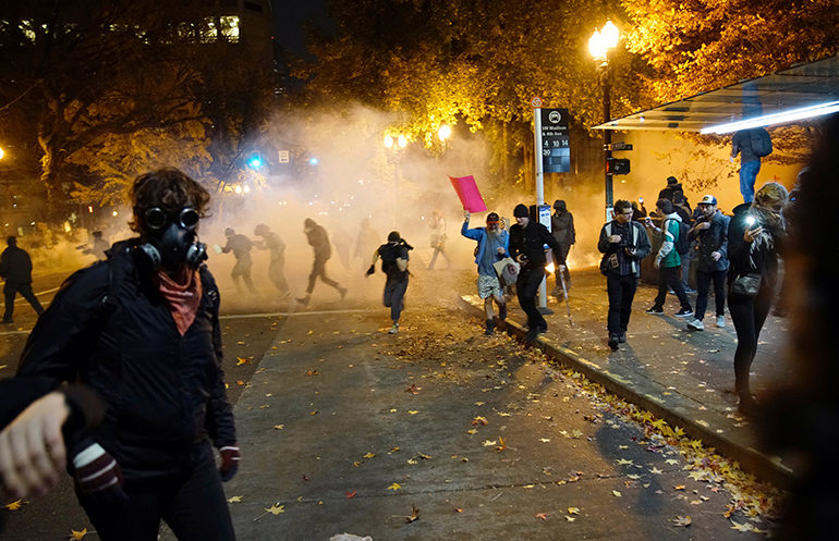 People try to move away from a gas cloud during a protest against the election of Republican Donald Trump as President of the United States in Portland, Oregon, U.S. November 12, 2016. REUTERS/William Gagan FOR EDITORIAL USE ONLY. NO RESALES. NO ARCHIVES