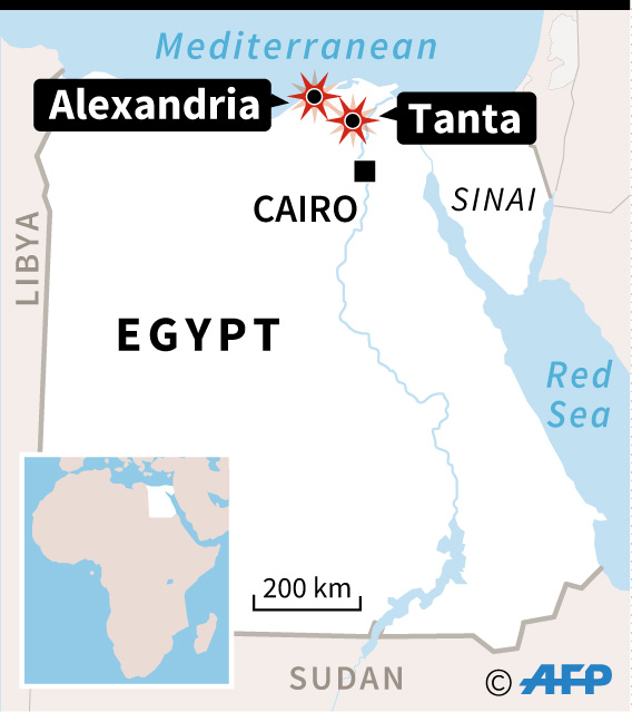 Updated map locating an attacks on a church in the Egyptian cities of Tanta and Alexandria – AFP / AFP / JONATHAN STOREY