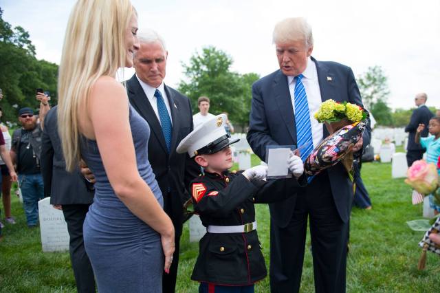 President Donald J. Trump and Vice President Mike Pence talk with Christian Jacobs, 6, and his mother Brittany at the grave of his father in Section 60 of Arlington National Cemetery, Arlington, Va., May 29, 2017. Christian visits with his mother, Brittany, every year for Memorial Day. (U.S. Army photo by Elizabeth Fraser/Arlington National Cemetery/released)