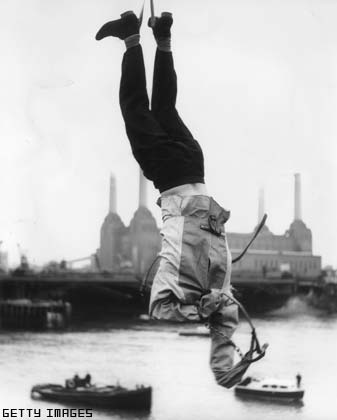 1923 Harry Houdini frees himself from a straight jacket while suspended upside down, 40 feet (12 m) above ground in NYC