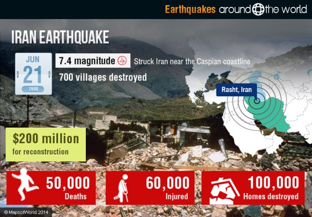 1990 Earthquake devastates Iran An earthquake near the Caspian Sea in Iran kills more than 50,000 and injures another 135,000 people on this day in 1990. The 7.7-magnitude tremor wrecked havoc on the simply constructed houses in the area. A 20,000-square-mile area in the provinces of Zanjan and Gilan was absolutely devastated. This region encompasses both farms and sea resorts–all were demolished. In towns along one 80-mile stretch, every single building was reduced to rubble and every single resident was killed. history.com: http://tinyurl.com/m53ea8u