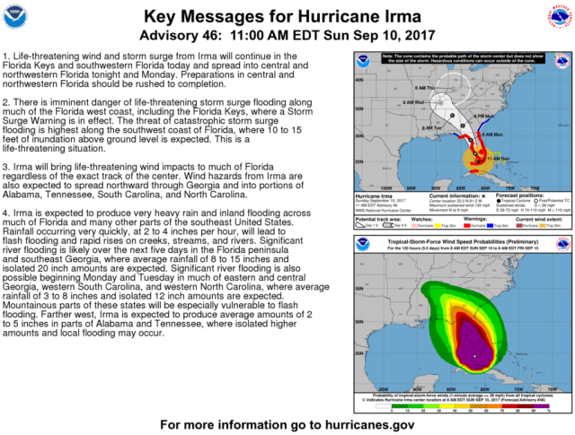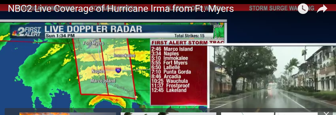 As of 1:00 pm, Irma is south of Marco Island, category 4, with a well-defined eye. It is moving faster again – 13-14 mph – and will be over Marco Island within the next hour, and headed directly for Naples, following Hwy 41.