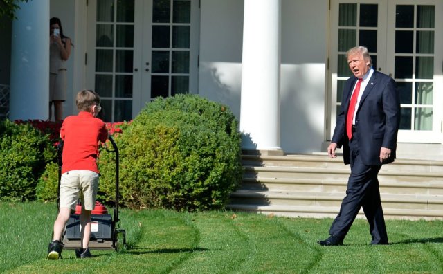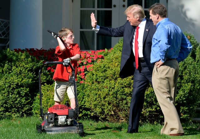 OMG He was so determined to do a good job, he didn’t even want to stop for the President. π And, so neat that Pres. Trump came out to see him.