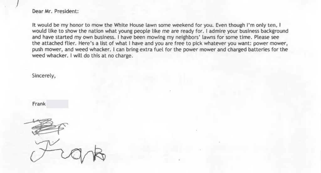Last month Sarah Huckabee Sanders read aloud this letter from a then-10-year-old named Frank offering to cut the White House lawn for free even though he usually charges $8.