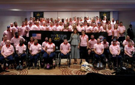 U.S. first lady Melania Trump on Saturday encouraged the American team participating in an Olympic-style competition for wounded service members and veterans to take their “fighting spirit” and “bring home the gold.”