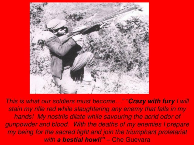 Out to lunch with a friend. Sitting at a table very close to me are two 20-something lads having a conversation about gun control, but not using their “inside voice” that mothers used to teach their children before everyone was “special.” I note one of the loud lads is wearing a T-shirt with an image of Che Guevara emblazoned on it….while speaking in passionately and loudly about gun control.