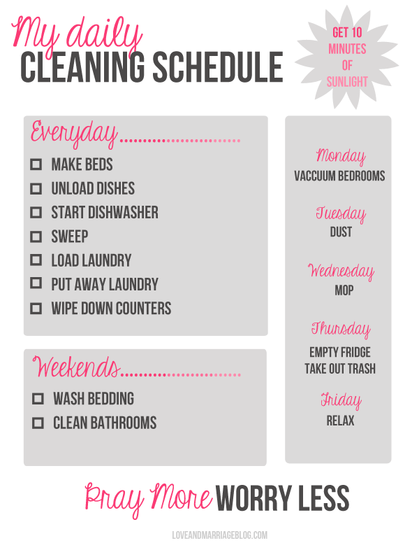 In conjunction with the above de-cluttering schedule, you might also want to try the daily cleaning schedule: