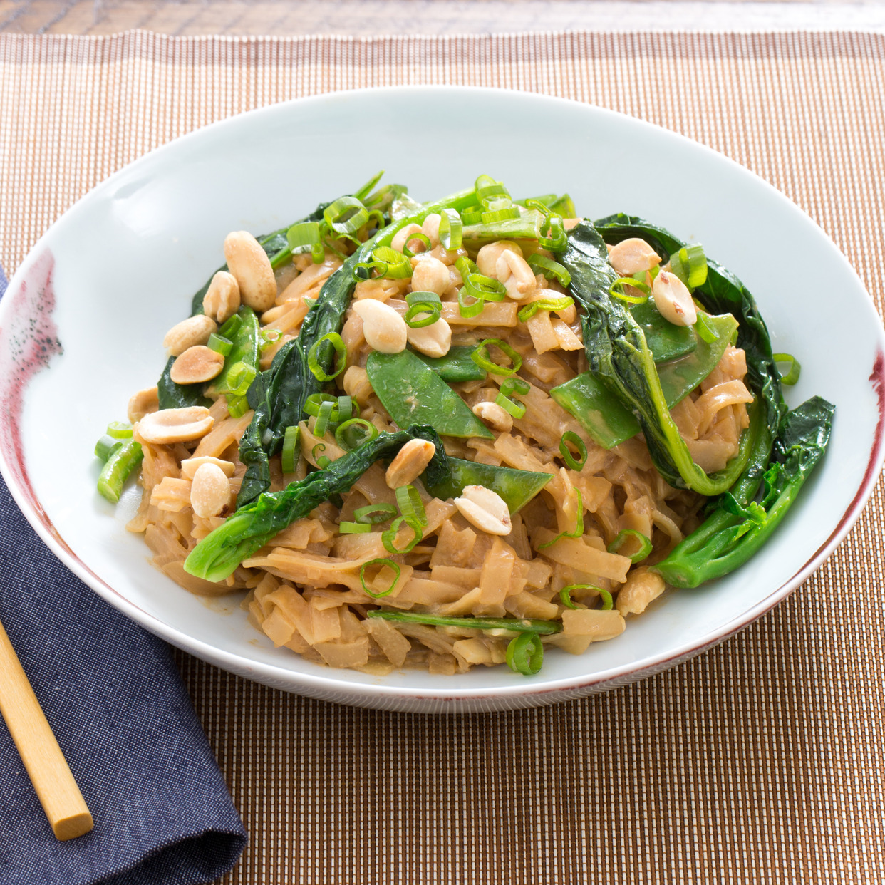 In a small bowl, make sauce by combining water, peanut butter, soy sauce, lime juice, brown sugar, freshly grated ginger, red pepper flakes and salt.