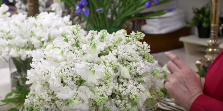 The State Dining Room will feature more than 2,500 stems of white sweet peas and nearly 1,000 stems of white lilac—both California and Dutch grown mixed.