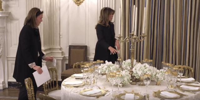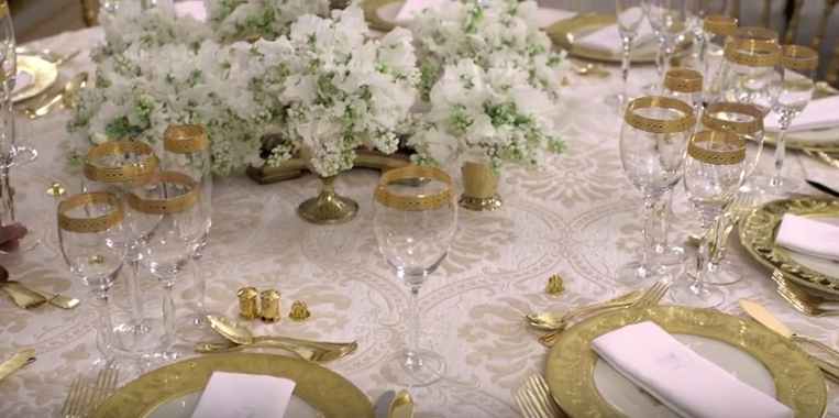 The color scheme is cream and gold and the china settings consist of the Clinton china for the baseplate, along with both Bush (43) and Clinton china for the dinner service. The First Lady chose the Bush china with the green color palette to complement the spring green and white flowers that will be featured in the State Dining Room. Mrs. Trump has also selected pieces from the extensive Vermeil collection as well as American Silver from the White House Collection—from Tiffany & Co. and S. Kirk & Sons—to add to the décor in the State Dining Room.