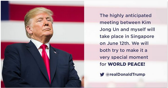 “The highly anticipated meeting between Kim Jong Un and myself will take place in Singapore on June 12th,” the president wrote on Twitter. “We will both try to make it a very special moment for World Peace!”