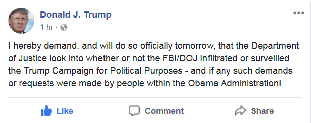 that the Department of Justice look into whether or not the FBI/DOJ infiltrated or surveilled the Trump Campaign for Political Purposes (Loretta Lynch and James Comey I’m looking at you 😎).