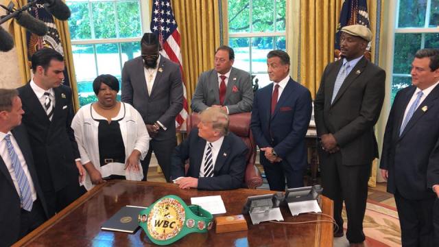 Trump welcomed Johnson’s family, current heavyweight champion Deontay Wilder and actor Sylvester Stallone to the event at the White House on Thursday. Stallone, who played the title character in the 1976 Oscar-winning boxing film Rocky, reached out to the president earlier this year to plead Johnson’s case.