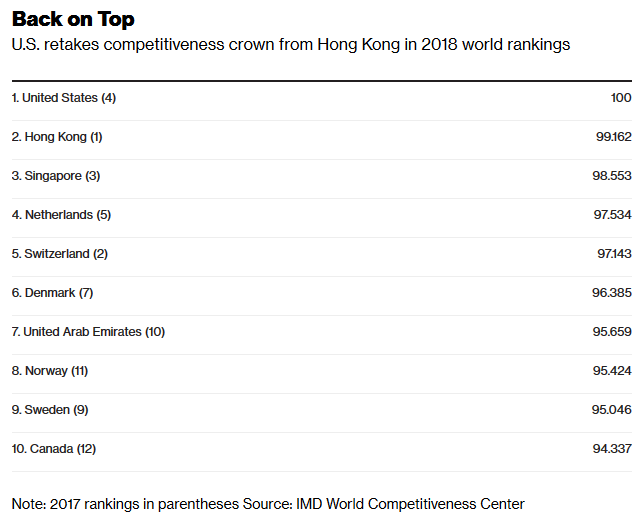 The U.S. dethroned Hong Kong to retake first place among the world’s most competitive economies, thanks to faster economic growth and a supportive atmosphere for scientific and technological innovation, according to annual rankings by the Switzerland-based IMD World Competitiveness Center.