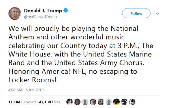 The Eagles were supposed to attend a ceremony at the White House on Tuesday, but Trump nixed those plans at the 11th hour, and will instead host “A Celebration of America” featuring military bands and the playing of the national anthem.