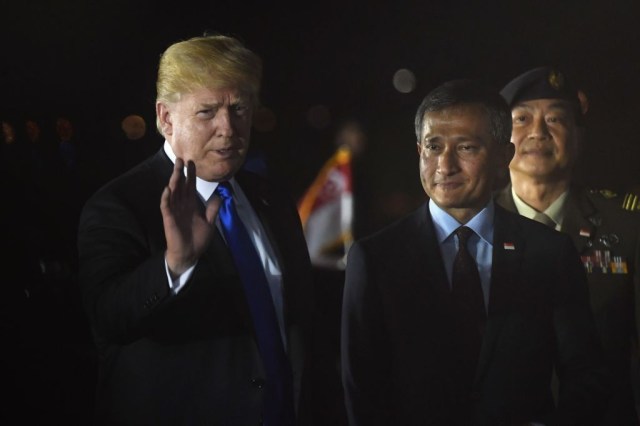 The president was greeted on the tarmac by Singapore’s Foreign Minister Vivian Balakrishnan and briefly waved to the press before departing in his presidential limousine.