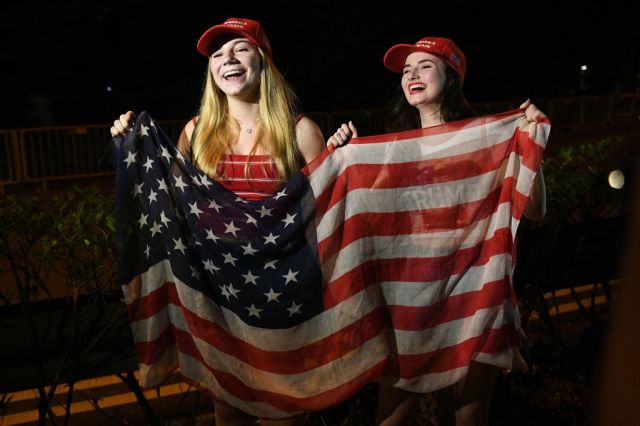 Erica Boland (R), a US student based in Singapore and a supporter of US President Donald Trump, and her friend wave a US flag as they wait for his arrival, outside the Shangrila hotel in Singapore on june 10, 2018. (TED ALJIBE/AFP/Getty Images)