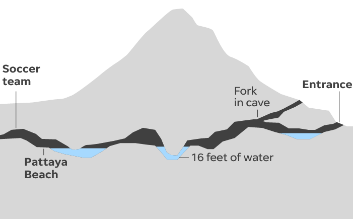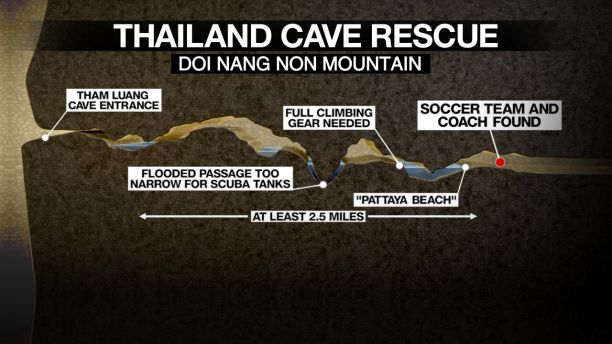 Divers found the boys were on a ledge in an air pocket about 2.5 miles into the cave, about a half-mile down. At least 1.5 miles of the path is under muddy water – about 15 feet at some point.