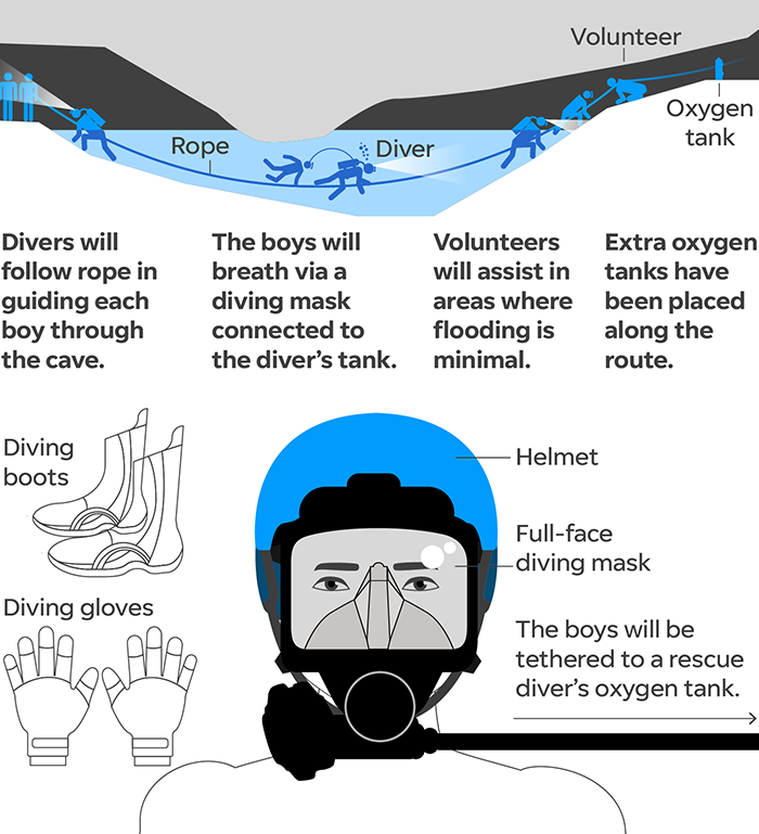 While water was being pumped out of the cave, divers placed a safety rope and additional oxygen tanks along the path between the cave mouth and the “Pattaya Beach” where the boys were located.