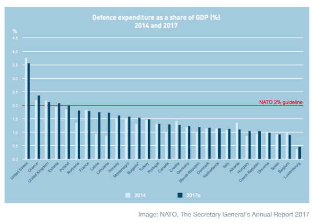 Only 5 of the 28 NATO countries currently are meeting or exceeding their 2% of GDP target. They are the United States, Greece, Great Britain, Estonia, and Poland.