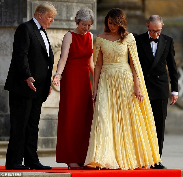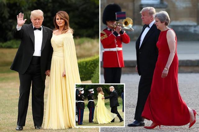 First lady Melania Trump is wearing a yellow silk pleated chiffon dress by New York-based J. Mendel to a gala at Blenheim Palace.