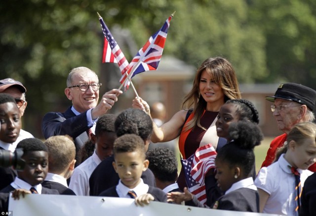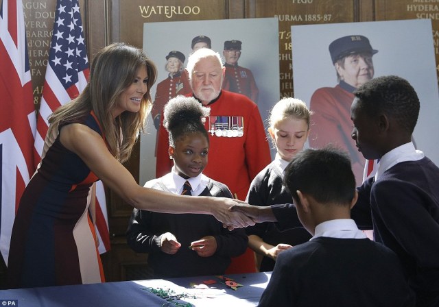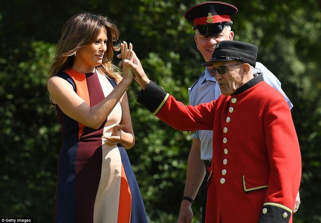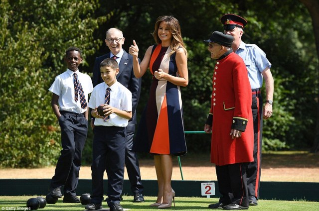 The first lady, who wore a £1,550 Victoria Beckham dress and 4in heels, looked in excellent spirits as she joined Chelsea Pensioners and local schoolchildren for the game. Mrs Trump, who will later join the president to meet the Queen, ended her turn on the green by high-fiving a Chelsea Pensioner, much to his delight (bottom).