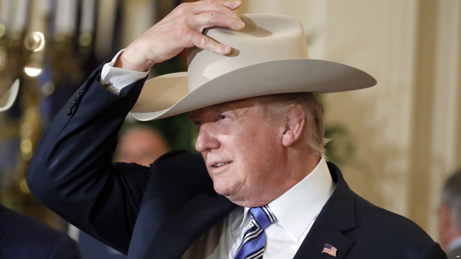 President Donald Trump tries on a Stetson hat during a “Made in America,” product showcase featuring items created in each of the U.S. 50 states, at the White House, in Washington, July 17, 2017.