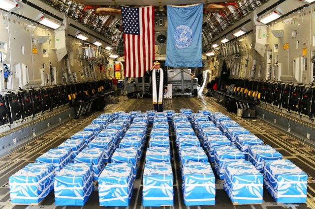 TOPSHOT – A UN honor guard carries a box containing remains believed to be from US servicemen killed during the 1950-53 Korean War, after arriving from North Korea at Osan Air Base in Pyeongtaek on July 27, 2018, the 65th anniversary of the armistice that ended the fighting.