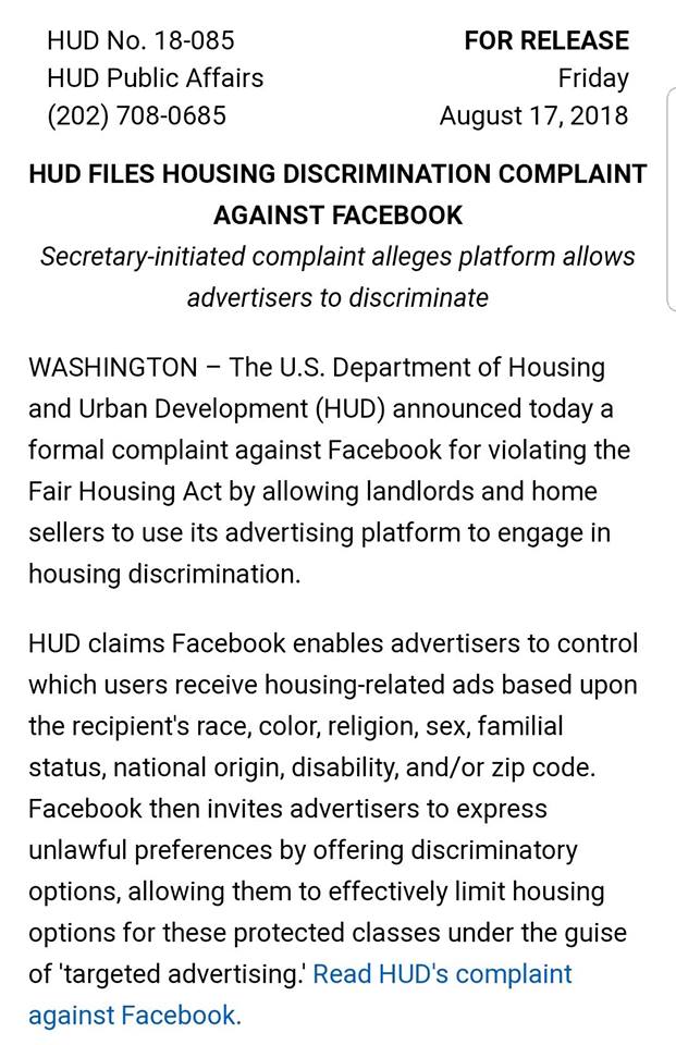 WASHINGTON – The U.S. Department of Housing and Urban Development (HUD) announced today a formal complaint against Facebook for violating the Fair Housing Act by allowing landlords and home sellers to use its advertising platform to engage in housing discrimination.