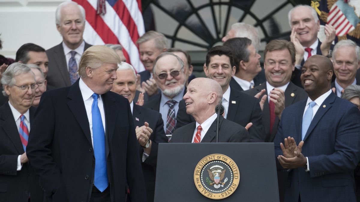 House Ways and Means Committee Chairman Kevin Brady (R-Texas), center, looks at President Trump in December as Republicans celebrated passage of last year’s tax cut bill. Brady is pushing follow-up legislation that would make the temporary individual tax cuts permanent. (Carolyn Kaster / AP)