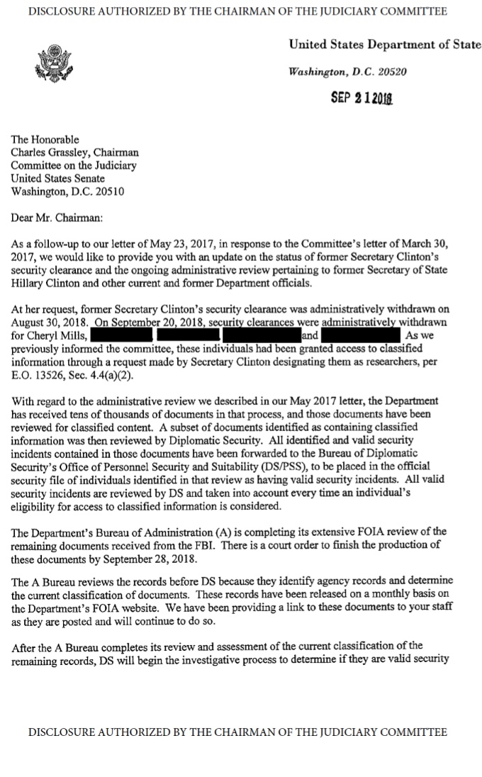 The update was provided to Senate Judiciary Committee Chairman Chuck Grassley and is being released for the first time following consultation with the State Department.  The update follows a letter from the Department in May of 2017 confirming the Department’s review into any mishandling of classified information stemming from the use of Clinton’s non-government email server.  That letter, which responded to an inquiry from Grassley, also outlined the review and adjudication process.