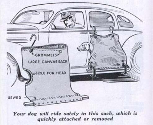 My goodness, that sack contraption is a terrible idea unless it is attached so the dog is facing the other way. Facing front he will get dirt, gravel, rain, mud and who knows what all else right in his eyes and ears.