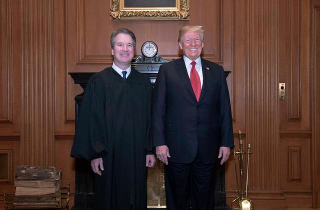 In this image provided by the Supreme Court, President Donald Trump poses for a photo with Associate Justice Brett Kavanaugh in the Justices’ Conference Room before a investiture ceremony Thursday, Nov. 8, 2018, at the Supreme Court in Washington. (Fred Schilling/Collection of the Supreme Court of the United States via AP)