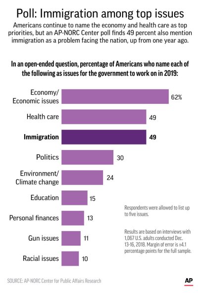 As much of the U.S. government remains shut down over President Donald Trump’s insistence on funding for his border wall, nearly half of Americans identify immigration as a top issue for the government to work on this year.