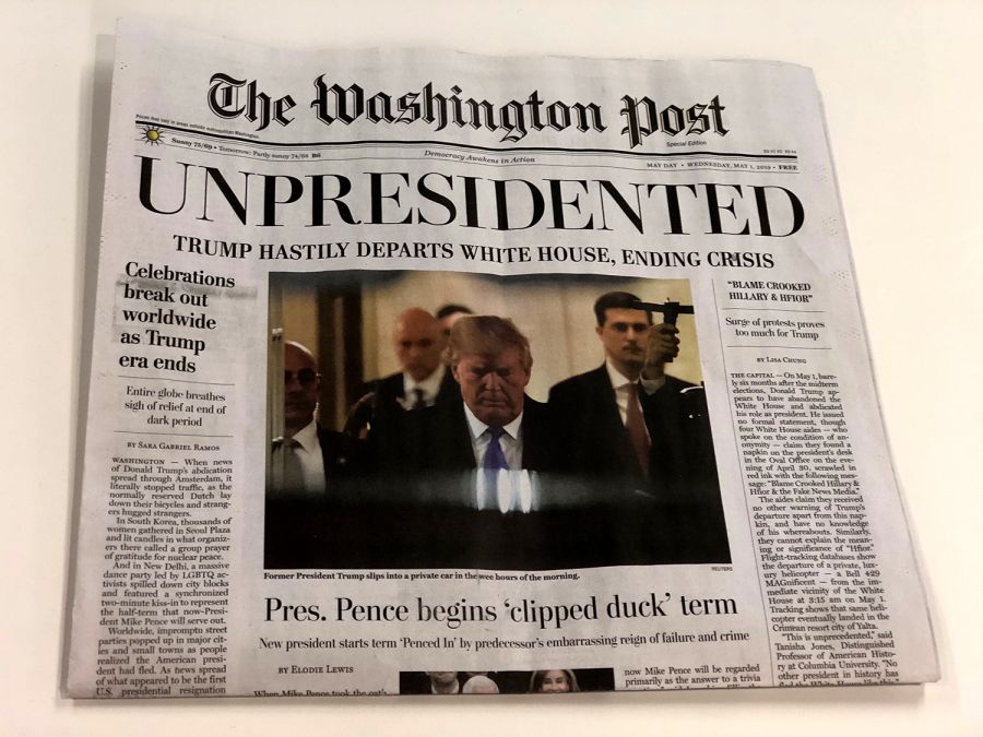 Under the headline “Unpresidented,” the fake newspaper’s lead story said that Trump had left a resignation message on a napkin in the Oval Office and left Washington for Yalta, the Crimean resort that was the site of a meeting of Allied leaders during World War II…
