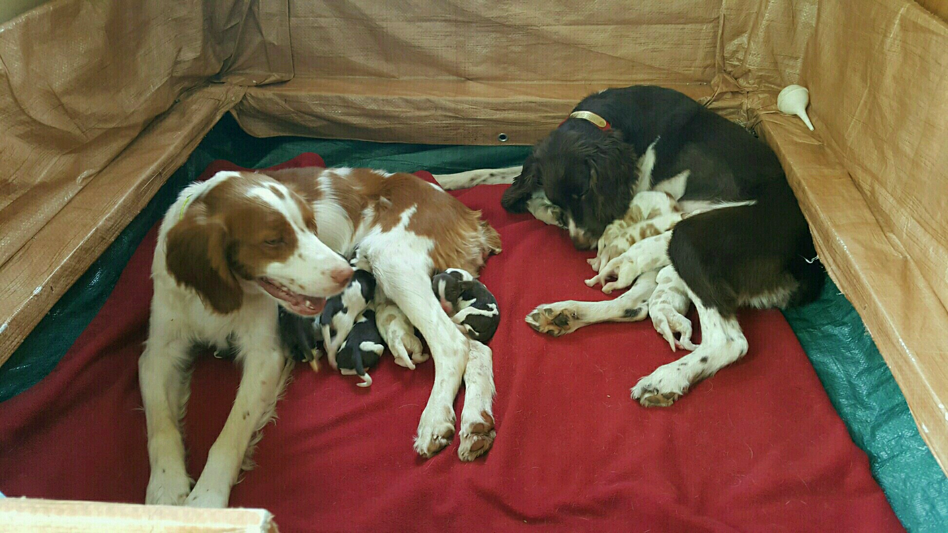 Mom Josie on the left, and great-grandma Sadie on the right. All the pups belong to Josie; great-grandma is helping out since her own puppies were just weaned. Puppies still have their tails in this pic, so they are less than 2 days old.