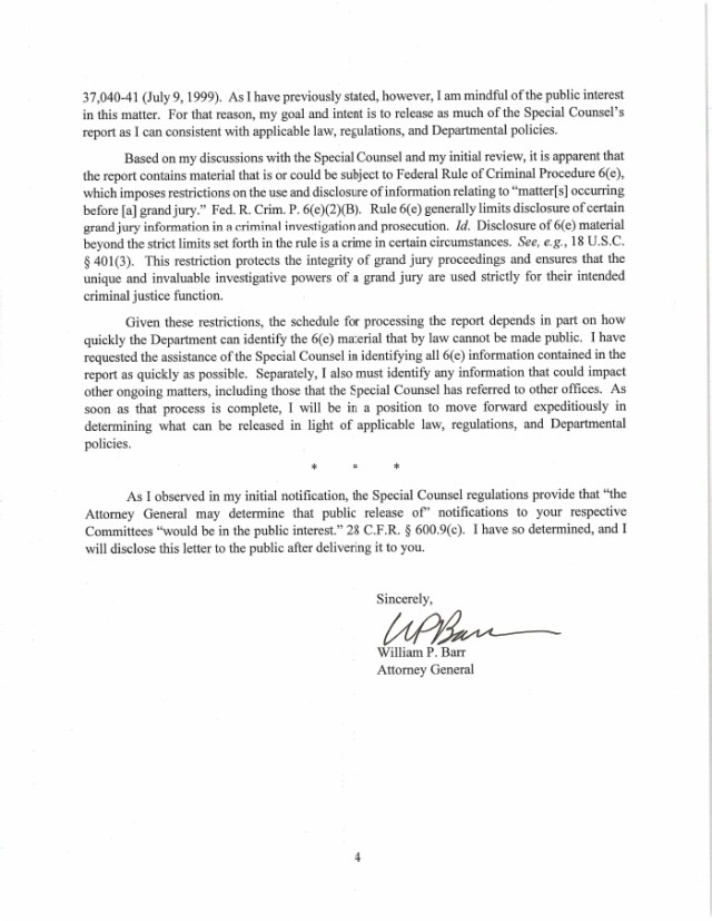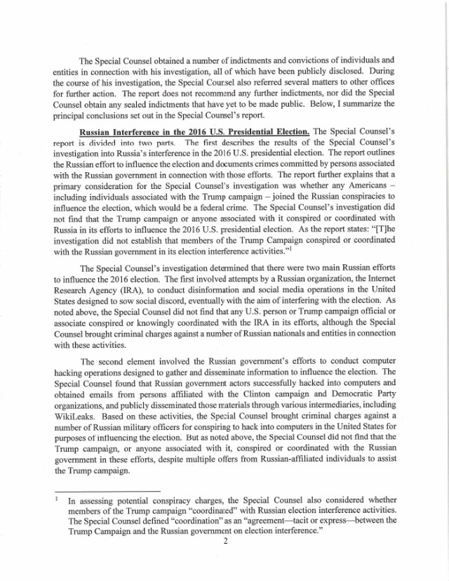 The following is Attorney General Bill Barr’s letter to key congressional leaders summarizing the findings of Special Counsel Robert Mueller’s Russia investigation report: