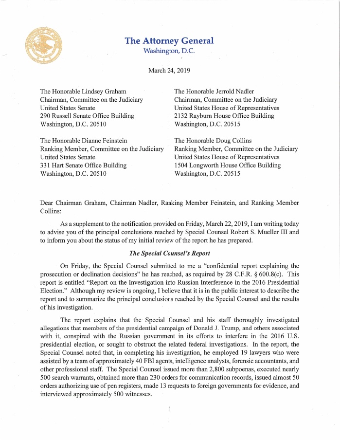 The following is Attorney General Bill Barr’s letter to key congressional leaders summarizing the findings of Special Counsel Robert Mueller’s Russia investigation report: