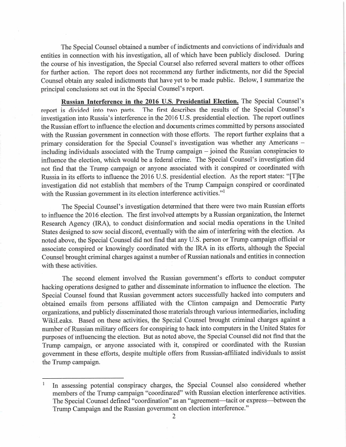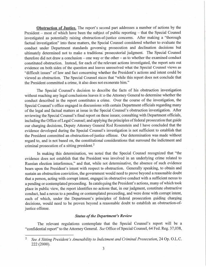 By the way, on page 3, the AG says that there is no basis for an obstruction charge. The mantra seems to be (right at the moment) that the President wasn’t exonerated of obstruction (as lovely pointed out, if they didn’t find anything to indict, then the President is innocent.) As we all are “innocent until proven guilty”.