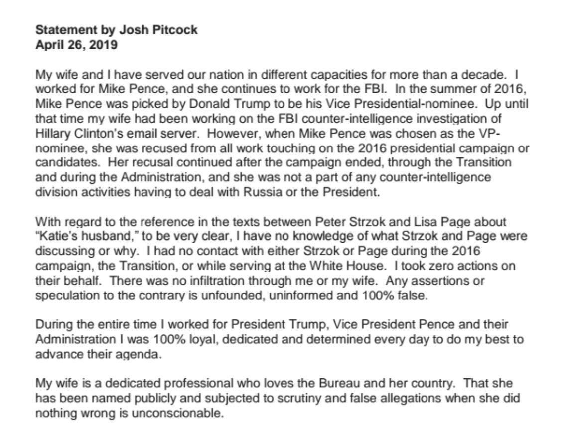 You may have heard that a man named Joshua Pitcock was possibly an informant for the FBI inside the White House. Mr. Pitcock’s wife, Katherine, is an employee of the FBI who was assigned to the Hillary Clinton email investigation. Josh Pitcock was a member of President Trump’s transition team, then worked for VP Mike Pence as his Chief of Staff during the first six months of the Trump administration, leaving in July of 2017. Pitcock  also worked for Mike Pence when he served in the House of Representatives.