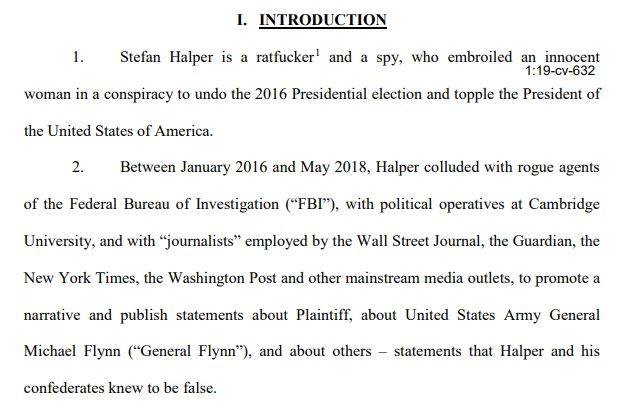 “Stefan Halper is a ratfucker and a spy, who embroiled an innocent woman in a conspiracy to undo the 2016 Presidential election and topple the President of the United States of America,” Lokhova wrote in the lawsuit, which she filed in federal court in Virginia.