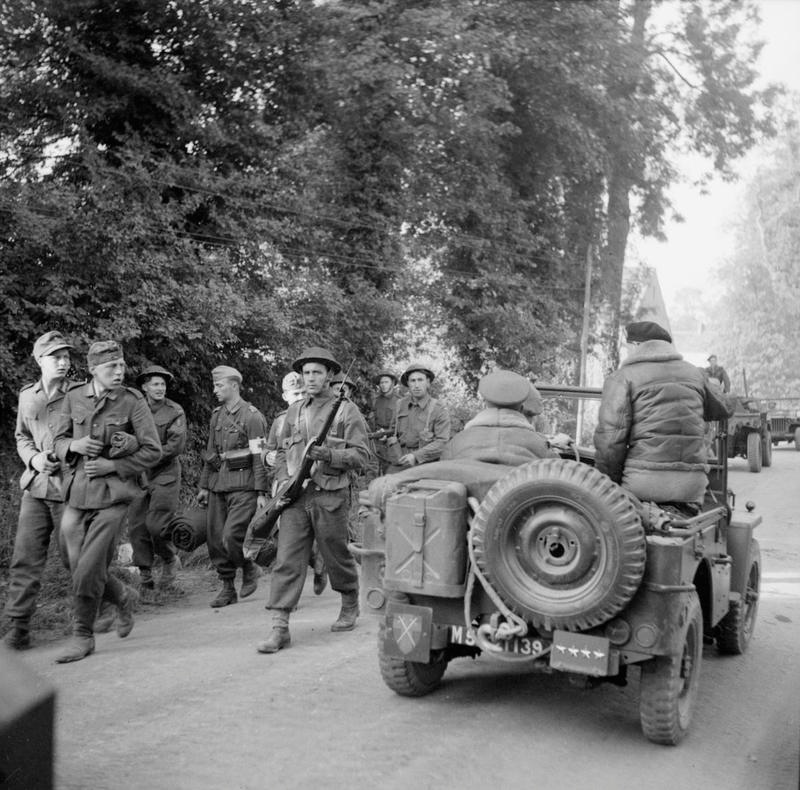General Sir Bernard Montgomery passes German POWs while being driven along a road in a jeep, shortly after arriving in Normandy, 8 June 1944.