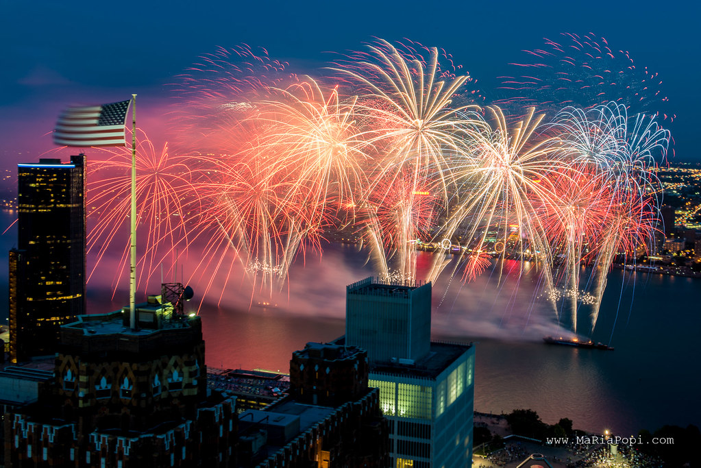 The fireworks are launched from three barges anchored in the Detroit River, and took place last Monday, June 24. Here they are.