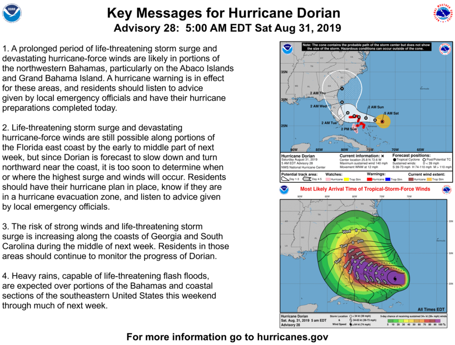 Hurricane Dorian’s forecast track continued its shift east Saturday morning, maintaining the threat to Florida’s east coast but increasing the chance the storm will spare the state a direct hit.
